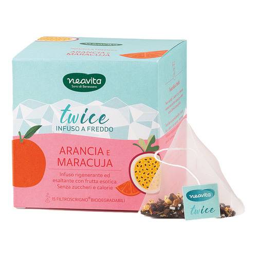 Neavita Twice infuso a freddo Arancia e maracuja Descrizione Selezione di frutti e foglie naturalmente privi di zuccheri e calorie. Pregiati frutti e foglie in taglio tisana. Formato 15 filtri da 3,5 g